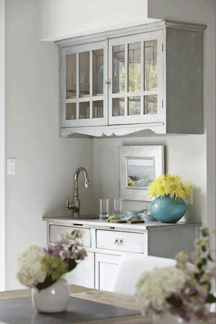 "An antique hutch from New England was converted to a wet bar adjacent to the kitchen." Faucet by Kohler.